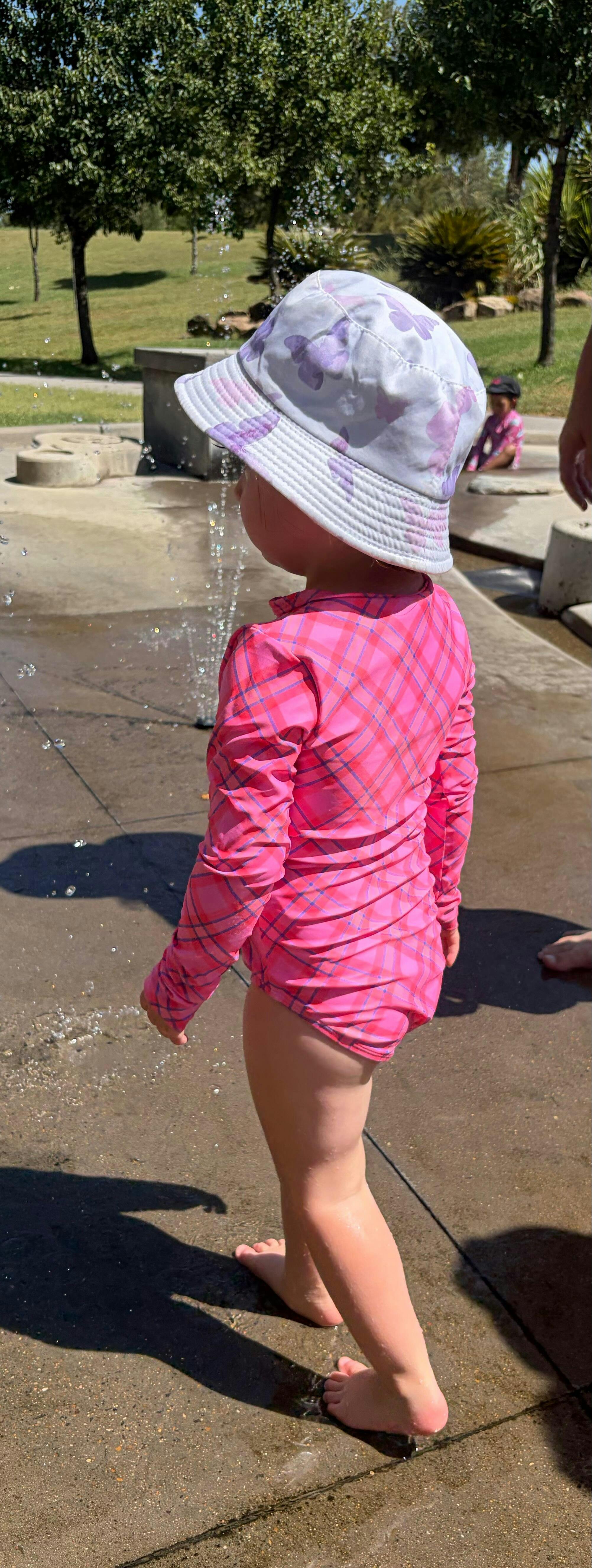 Milky Clothing Plaid Check Swimsuit. Make a splash in style with our pink, purple and orange Plaid Check Long Sleeve Swimsuit. This swimsuit is designed to keep your little one sun-safe and swim ready. With full length sleeves and a UPF 50+ rating, it's perfect for long days at the beach or by the pool.