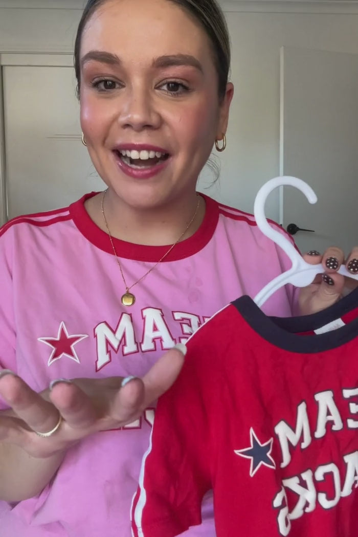 Featuring a bold puff print slogan with sporty star details, this tee brings big fun energy with a contrast stripe down the sleeve for an easy athletic vibe. It’s bright, playful and designed to stand out without trying too hard.